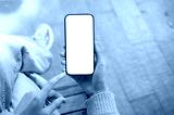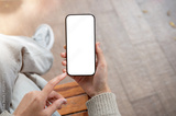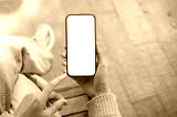 Top view of a woman uses her phone while sitting indoors. the smartphone with a white screen mockup