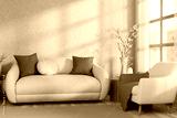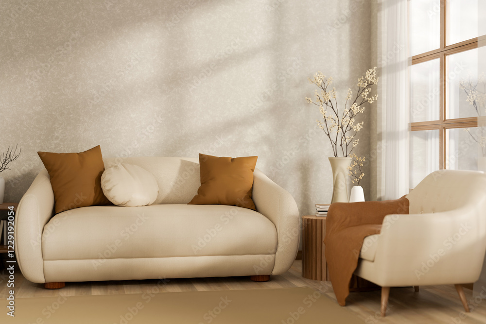 A contemporary Scandinavian beige living room features a beige sofa and armchair with brown pillows.
