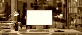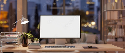 A computer placed on a wooden table in a luxurious living room, illuminated by warm ambient lighting