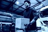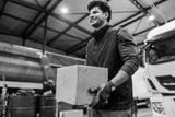 Committed serviceman with dirty cardboard box in hands walking around truck service.