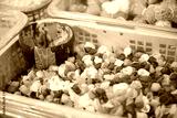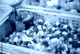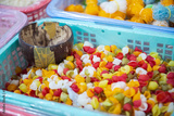 Shell macaroni tricolor in large plastic basket with coconut shell scoop, clear liner, mixed pasta, helical corkscrew fusilli, vegetable flat noodle at local market, Can Tho, Vietnam, raw vegan