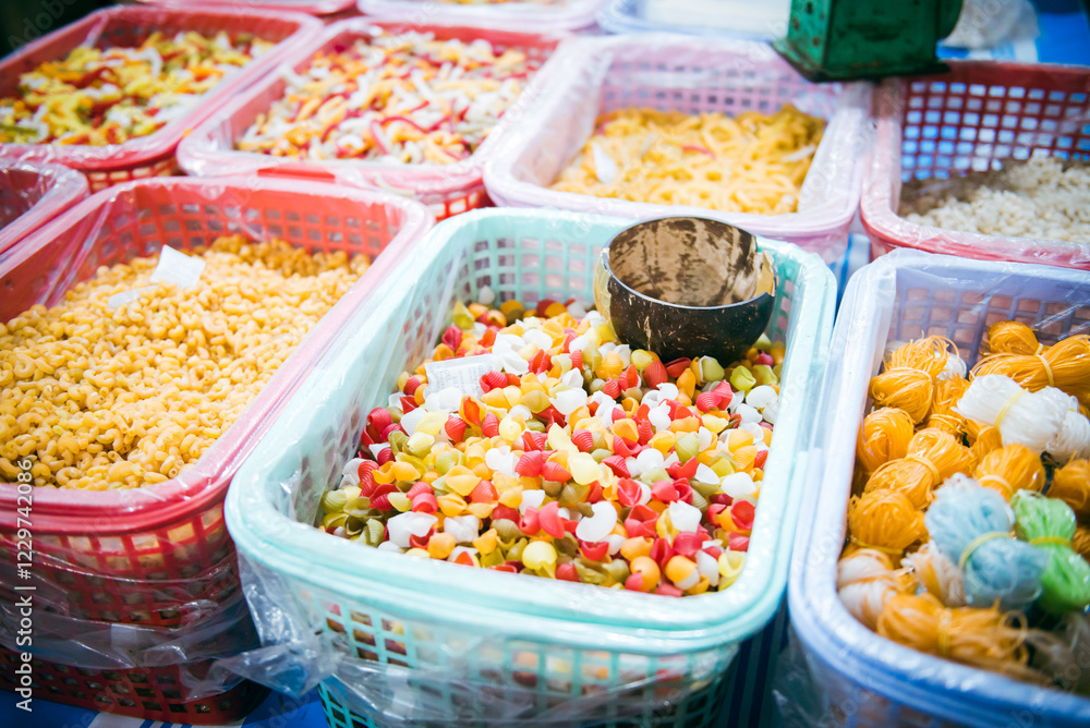 Desiccant bags in large plastic baskets with clear liner selling colorful macaroni, pasta, helical corkscrew fusilli, vegetable flat noodle at local market in Can Tho, Vietnam, organic raw vegan