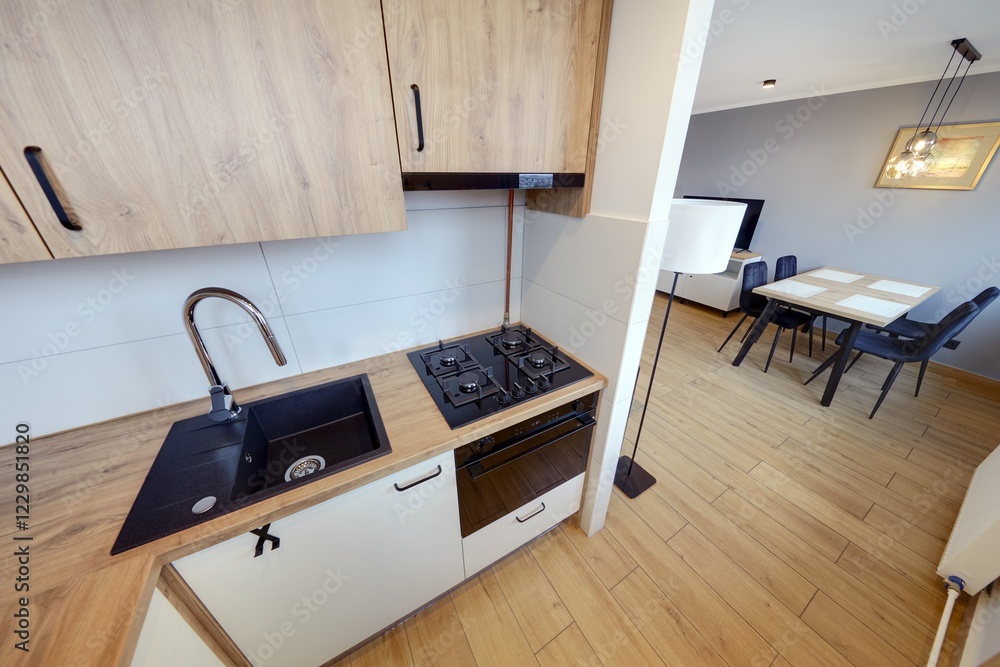 Kuchnia w nowoczesnym apartamencie w jasnych kolorach , biel, i jasno brązowym blatem