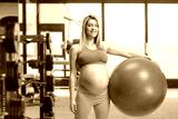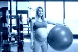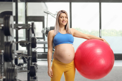 Pregnant woman with a crop top and leggings holding a fitness ball
