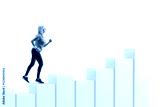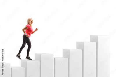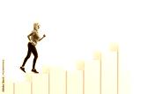 Full length profile shot of a middle aged woman running on rising bar chart columns