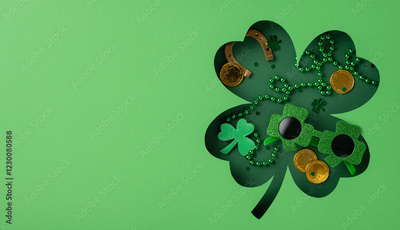 Festive St. Patrick's Day shamrock cutout with gold coins, beads, and green-themed decorations