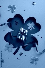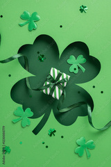 Green vertical shamrocks surround a small gift wrapped with striped paper and ribbon for a festive holiday theme