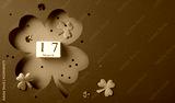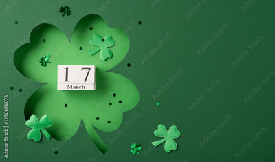 Green-themed St. Patrick's Day scene featuring shamrock-shaped decorations and a wooden calendar highlighting March 17