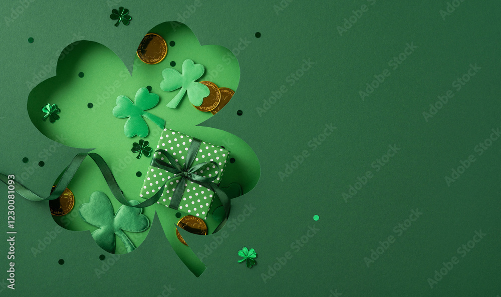 Festive St. Patrick's Day image with green clovers, a decorative green gift box, golden coins, and confetti