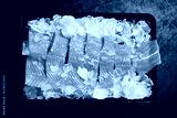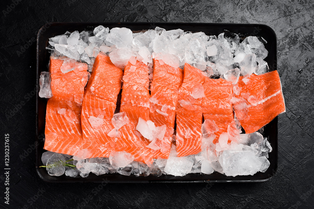 Fresh pieces of salmon on ice. Raw fish steaks. Top view. Black stone background.