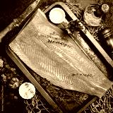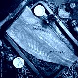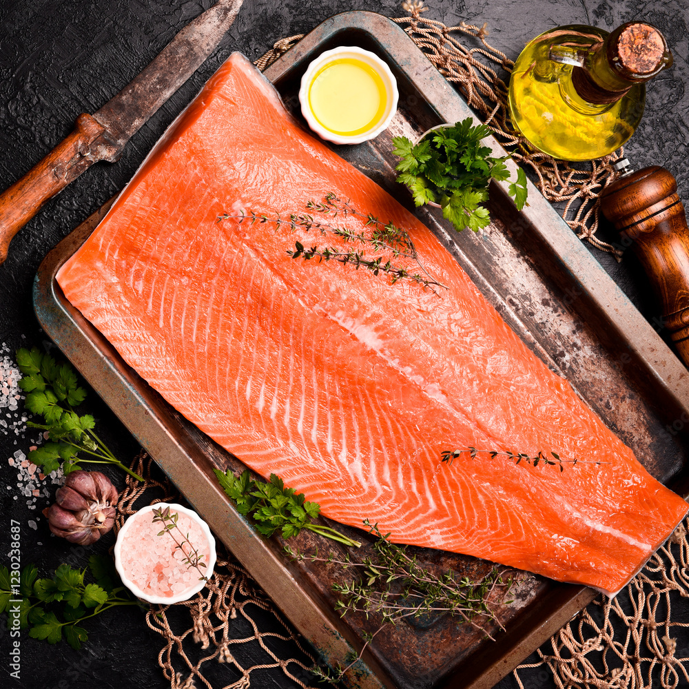 Close-up of a whole salmon or trout fillet in a metal pan, ready to cook. Top view.
