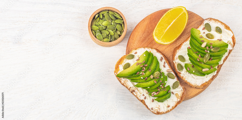Avocado toast with cream cheese and seeds on white background. copy space, top view