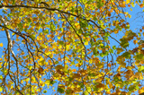 Autumn vivid yellow canadian maple leaves background. Bright fall foliage wallpaper. Selective focus and shallow DOF