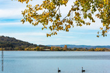 Autumn leaves with blurred black swans on lake on the background. Bowen Park, Canberra, Australian Capital Territory, Australia. Selective focus on leaves, shallow DOF