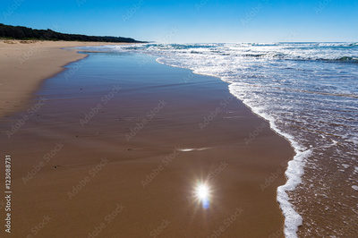 Seashore low angle shot with sun reflection on wet sand and water edge on the background