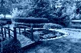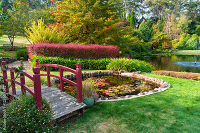 Wooden bridge over a pond in an autumn park. Bisley garden, Mount Wilson, Australia