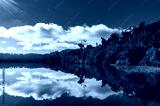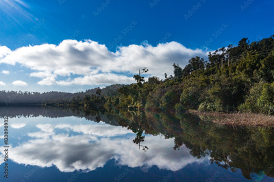 Lake Ianthe on calm sunny day landscape. Perfect water reflection of water edge with sun rays and sun flare. South Island, New Zealand