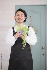 観葉植物を持つエプロン姿の男性 花屋や趣味の園芸イメージ カメラ目線