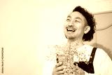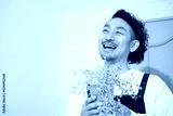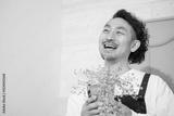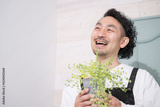観葉植物を持つエプロン姿の男性 花屋や趣味の園芸イメージ いらっしゃいませ~と見上げる