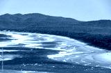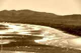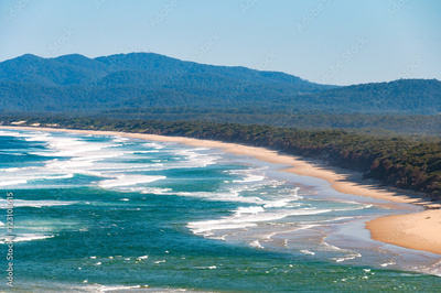 Aerial view of Australian coastal sand beach with mountains on the background. Nambucca Heads, NSW, Australia