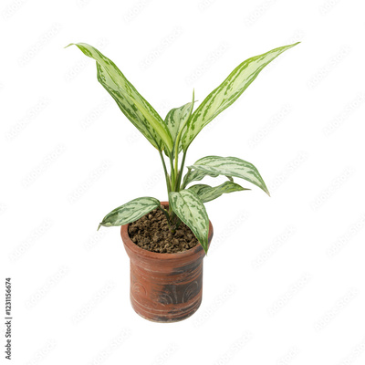 Aglaonema Silver Queen Plant in brown pot isolated on transparent background