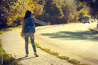 young woman hitch-hiking on a road at the fields
