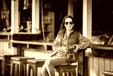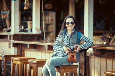 Portrait of smiling female with vintage camera discovering