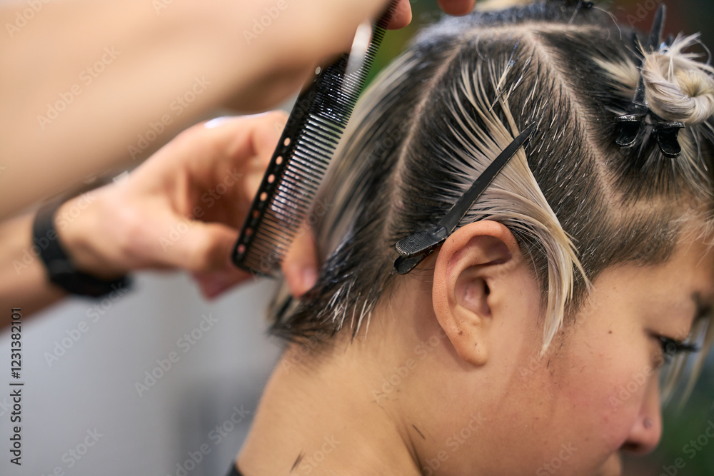 Hairdresser combing wet hair of young female model getting trendy haircut