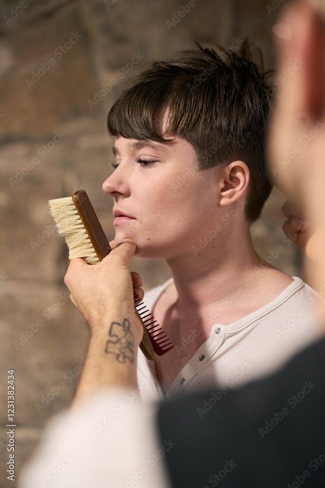 Hairdresser brushing model's short hair with tattooed hand