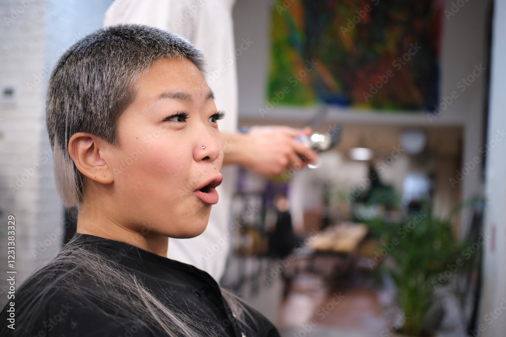 Hairdresser showing electric razor to surprised young woman with short dyed hair