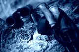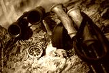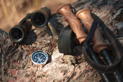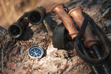 Magnetic compass on a wooden table. Nearby lies the binoculars