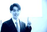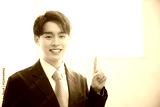 逆光の綺麗な窓辺でビジネススーツでポイントのポーズをする若いカメラ目線の男性 クローズアップ 右にコピースペースあり