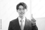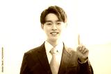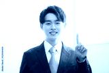 逆光の綺麗な窓辺でビジネススーツでポイントのポーズをする若いカメラ目線の男性 クローズアップ
