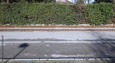 Concrete sidewalk half covered of fallen brown leaves. High privacy hedge on behind, urban street in front. Background for copy spac