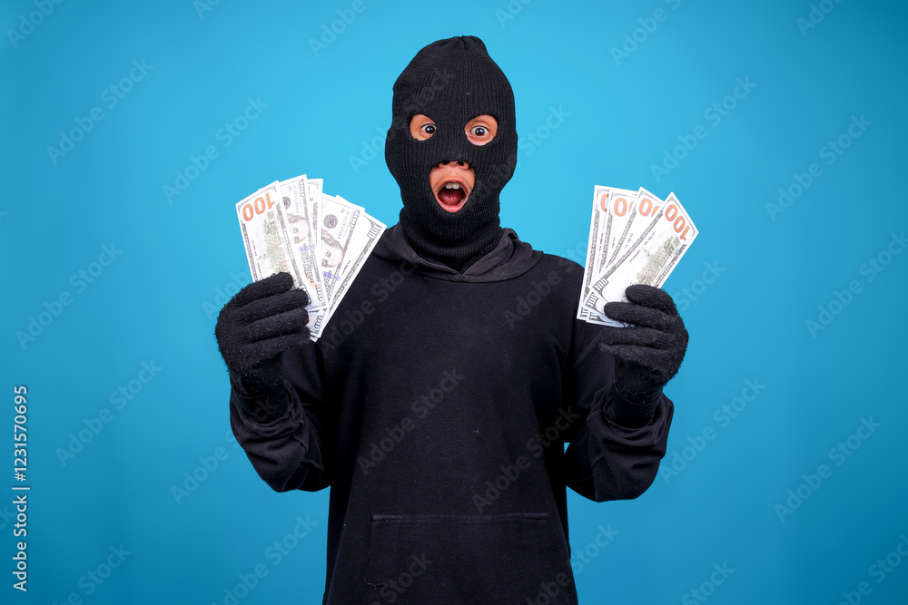 Shocked Disguise Thief Showing Dollar Money Isolated On Blue Background