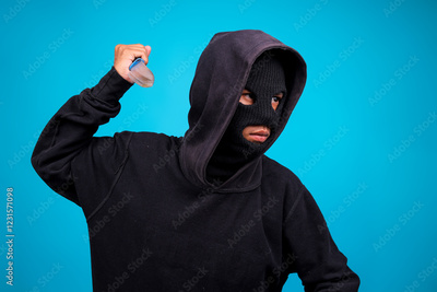 Man In A Black Hood Using Mask Stabbing With Knife Isolated On Blue Background