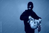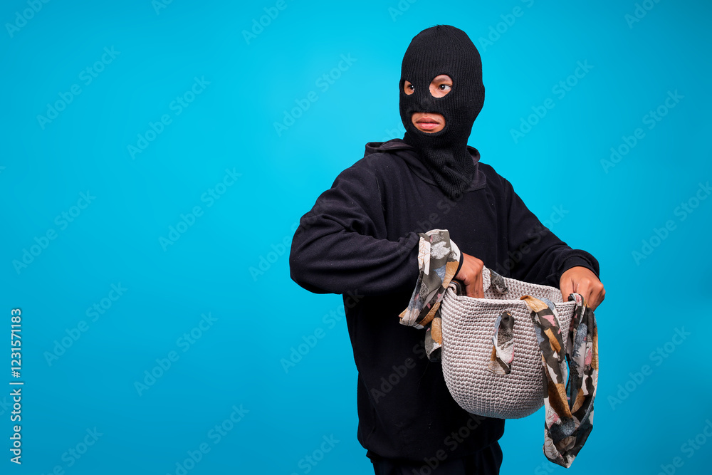Portrait Of Disguise Thief Holding Stolen Bags Over Blue Background