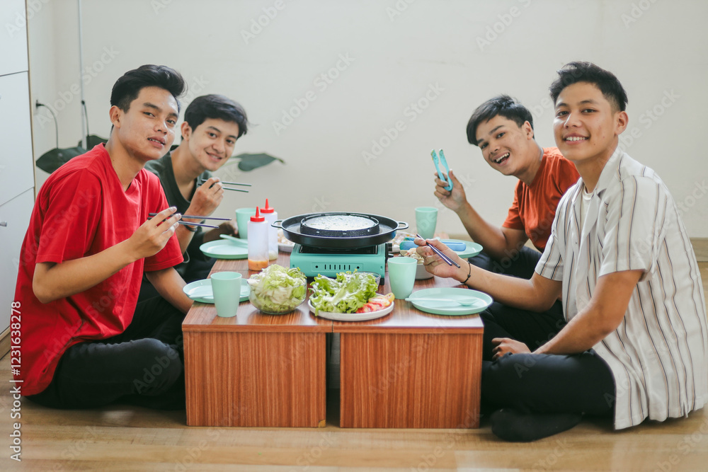 Portrait Of Young Diverse Friends Smiling At Camera While Having Lunch Together Cooking Korean Barbeque