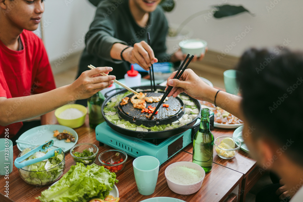 Few Hands Cooking Korean Barbeque Together Using Chopstick