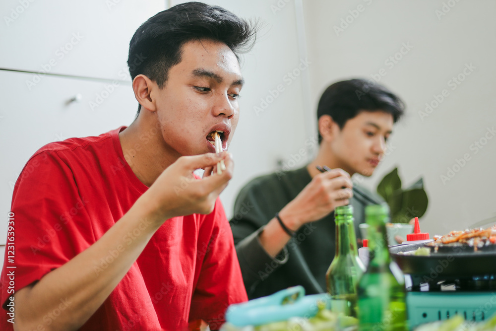 Young Friends Eating Lunch Together, Cooking Korean Barbeque At Home