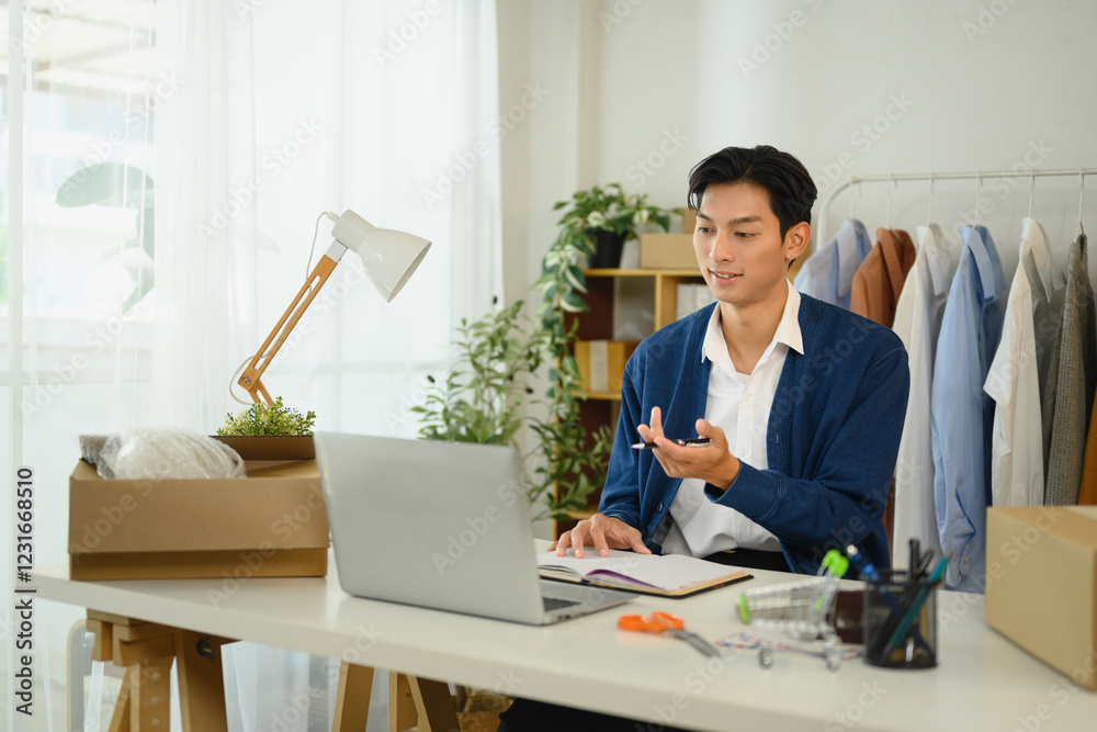 Online store owner working on orders and inventory at home office