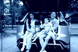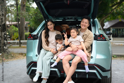 Cheerful family sitting in the open trunk of their car, enjoying a break during their road trip