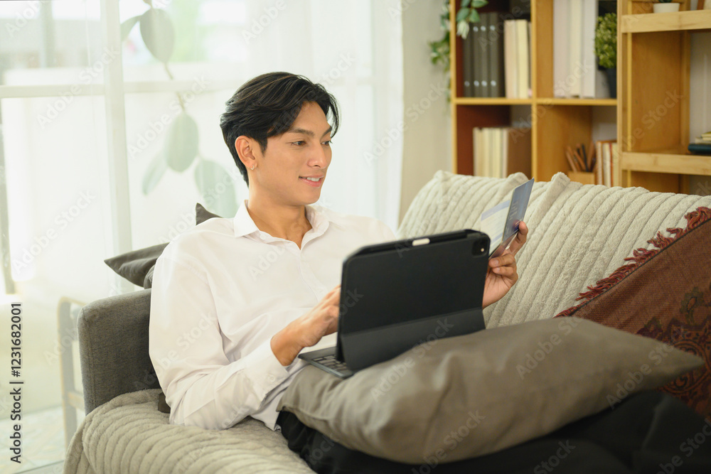 Smiling asian man holding a savings passbook and checking his financial transactions on digital tablet