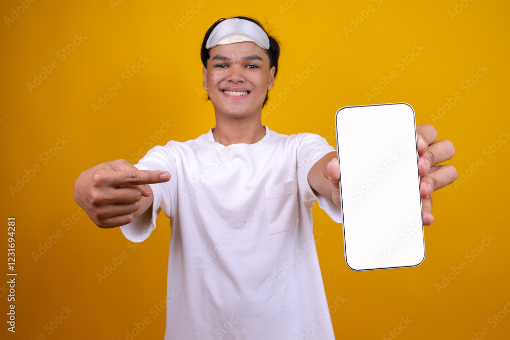 Young Asian Man Wear Pyjamas and Blindfold Pointing to Smartphone Blank Screen for Mockup