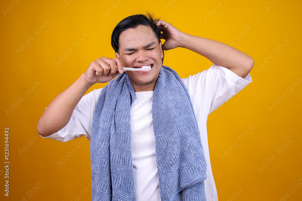 Portrait of Lazy Young Asian Man With Towel Around Neck Brushing Teeth Isolated Over Yellow Background