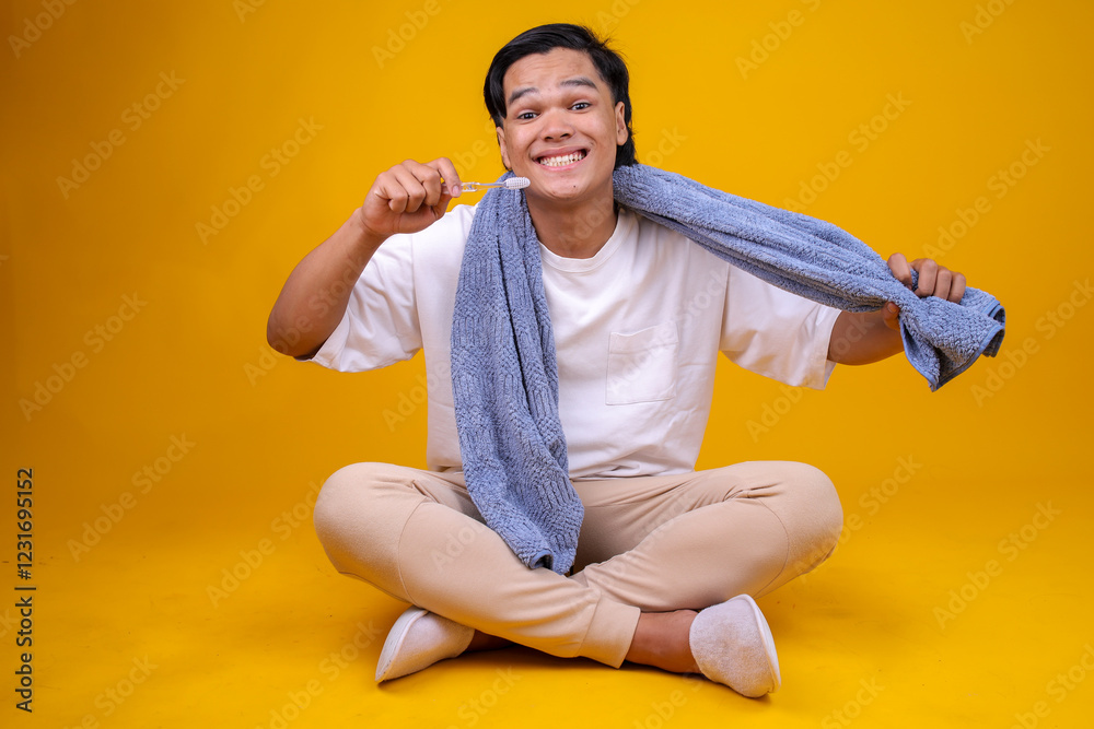 Excited Young Asian Man With Towel Around Neck Sitting While Brushing Teeth Isolated Over Yellow Background