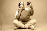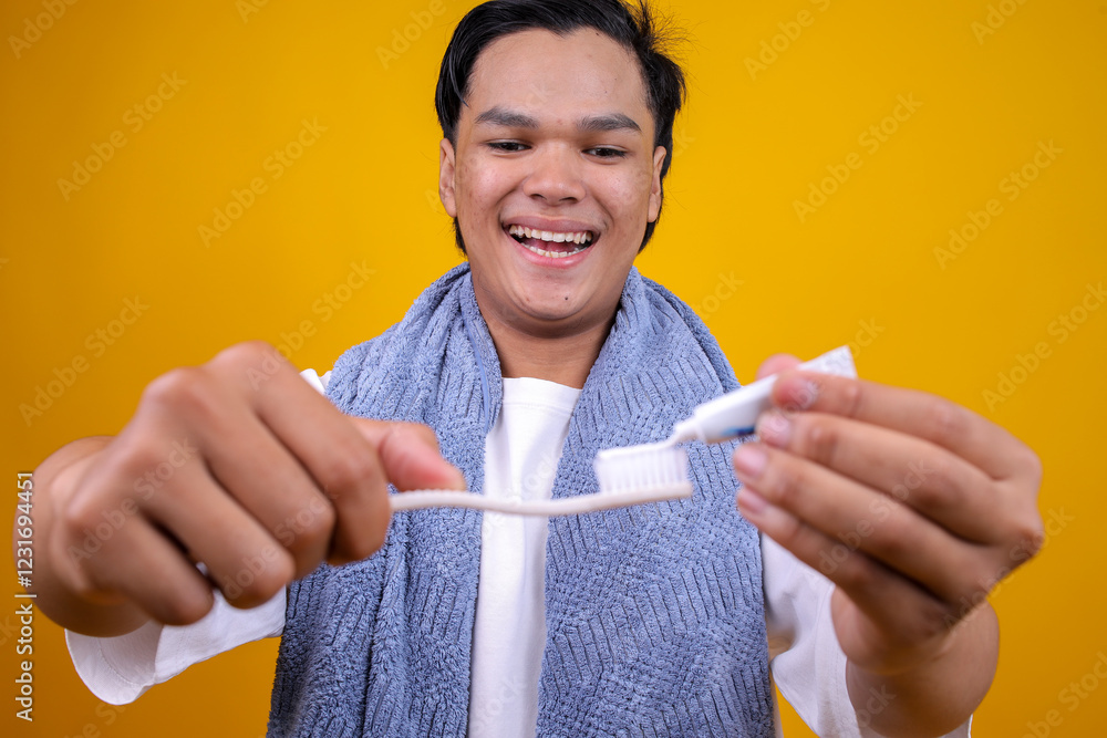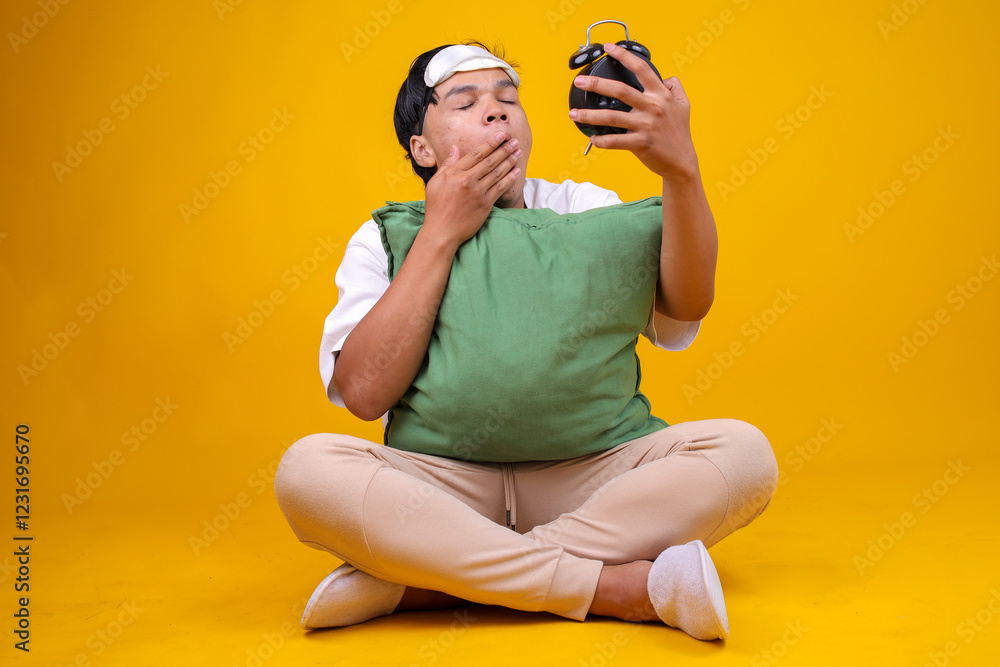 Full Body of Tired Asian Man Sitting With Pillow, Sleep Mask And Alarm Clock Yawning Over Yellow Background