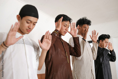 Group Of Muslim People Praying Salah Doing Takbir On First Procedure At The Mosque