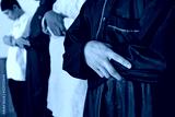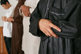 Close-up Of Muslim Worshipper Hands Putting Hands Below Chest Praying Salah In One Line