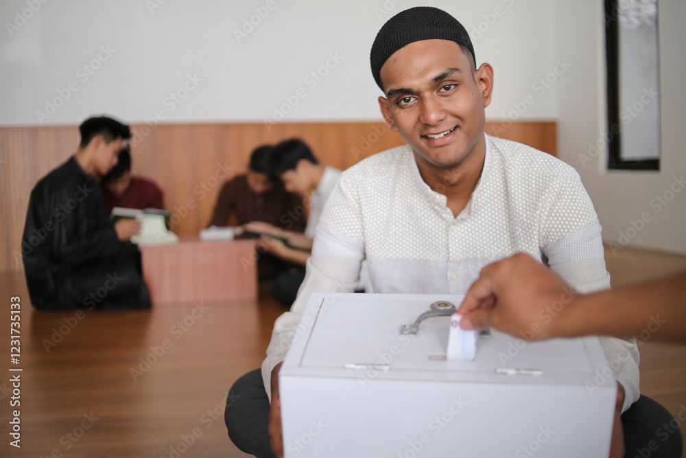 Smiling Young Muslim Man Holding Donation Box In The Mosque While Hands Inserting Money To The Box. Zakat Concept
